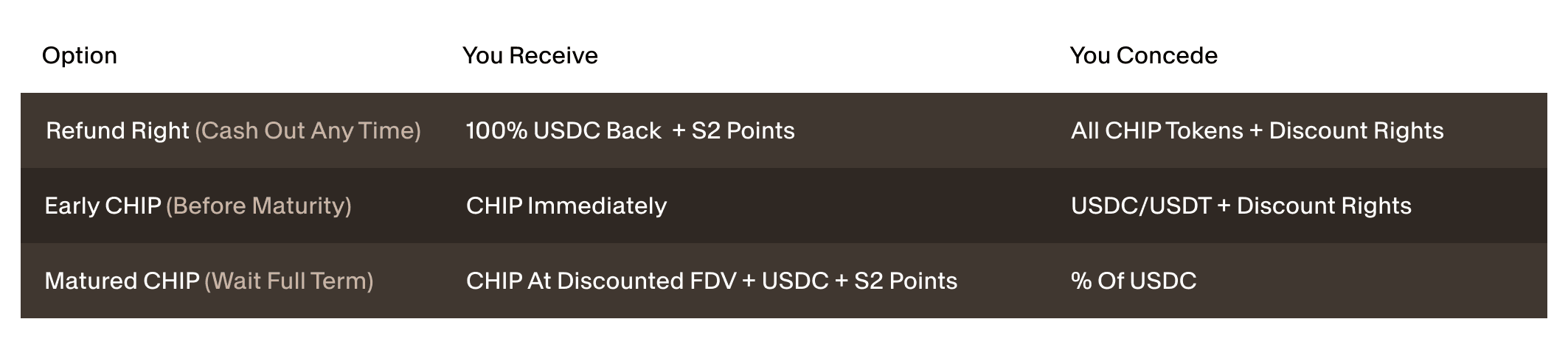 If you hold to maturity: you receive Discount Rights at $190M (8-month) or $270M (4-month), distributed using USDC, and all CHIP purchased in the ICO is released.